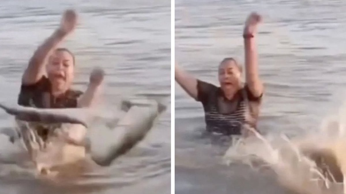 Une vidéo, devenue virale sur les réseaux sociaux, montre la baigneuse en train de s’asperger le visage avec de l’eau. Elle remarque ensuite quelque chose flotter entre ses jambes, pensant sans doute qu’il s’agit d’un morceau de bois.