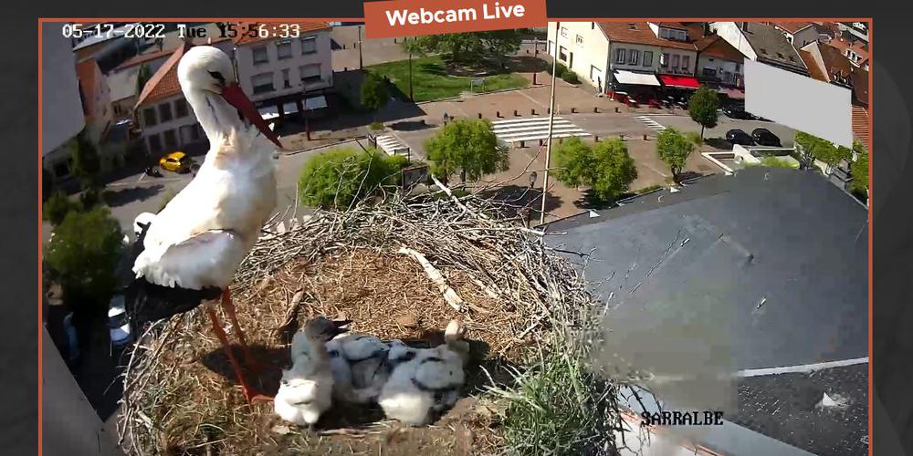 Au sommet de la mairie de Sarralbe, en Moselle, une webcam placée à côté d’un nid filme 24 heures sur 24 la vie d’un couple de cigognes et leurs cinq petits. Dimanche 15 mai 2022, dans l’après-midi, les quelques centaines de personnes qui suivaient en direct le quotidien des cigognes sur Facebook ont eu la mauvaise surprise d’assister à la chute de l’un des cigogneaux.