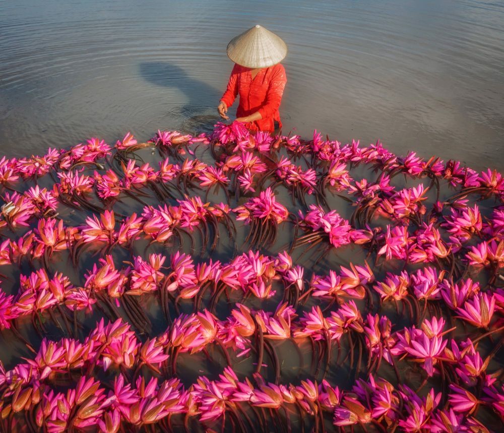 Chaque année, lorsque le delta du Mékong est inondé, les habitants rassemblent des hordes de lys à longue tige dans les rizières recouvertes d'eau. Certaines photos de Trung Huy Pham montre cette récolte annuelle dans les provinces de Long An et An Giang au Vietnam. De manière globale, ce photographe très talentueux fait la part belle aux population vietnamiennes qui vivent en symbiose avec la nature qui les entourent. Si vous aimez son travail et ses clichés, rendez-vous sur son compte Instagram pour en voir davantage.