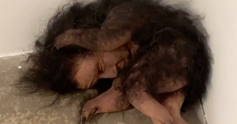 Sur ces dernières, on aperçoit cette chose velue recroquevillée dans un coin, en position fœtale. Bien qu’elle ressemble à un animal, comme en attestent ces quatre membres munis de longues griffes, elle arbore pourtant un visage humain.