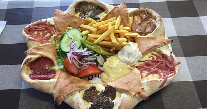 La fameuse et mystérieuse pizza de ce restaurant suédois s’appelle la Vulkan et autant vous dire que rien qu'à voir la photo, on sait déjà que cette recette cale bien le ventre. En effet, il faut croire que cette pizza est à... Tout. Eh oui, la Vulkan a une multitude d'ingrédients: oignons, frites, pepperonis, steak haché, mayonnaise, tomate, concombres... Et on en passe ! Bref, cette pizza peut mettre tout le monde d'accord avec la diversité des ingrédients qu'elle contient.