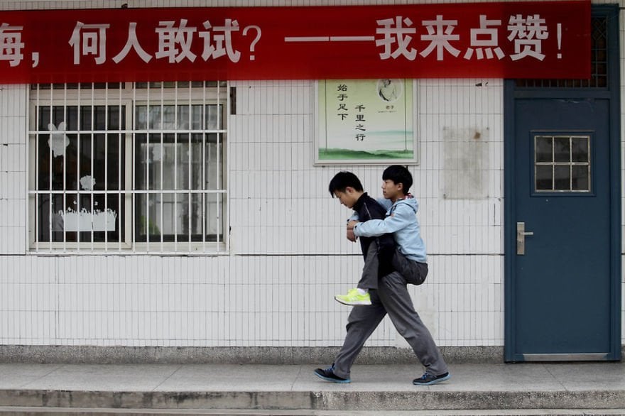 Les deux compères habitent en Chine, ils s’appellent Zhang et Xie et ont 18 et 19 ans. Zhang a une maladie musculaire qui l'empêche de marcher. C'est pourquoi tous les matins depuis trois ans, son meilleur ami Xie le porte sur son dos pour aller en cours.