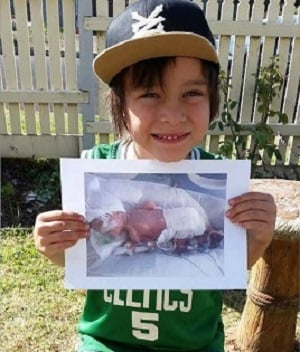 1 – Thomas est né au bout de 28 semaines et 6 jours, il pesait 867 grammes. Il a aujourd’hui cinq ans !