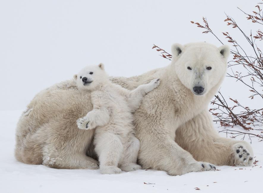 Dans le parc national Wapusk du Manitoba (Canada), une ourse polaire et son petit de quatre mois sont nichés près d'un saule.