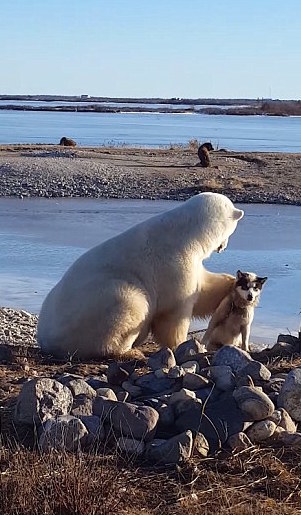 C’est une jolie leçon de vie offerte par David De Meulles, la semaine passée. Guide touristique à ses heures perdues, le Canadien résidant à Churchill (Manitoba, ouest du Canada) supervisait un groupe de touristes à la recherche de l’extraordinaire… quand il a alors filmé l’impensable : un ours polaire sauvage, câlinant un chien. Comme s’il était son maître. Mieux encore, comme s’ils étaient amis.