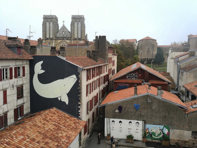 Réalisée à Bayonne (Pyrénées-Atlantiques), cette œuvre représentant une baleine laisse en effet apparaître des motifs une fois la nuit tombée. Ainsi lorsque l’obscurité surgit, on peut voir comme par magie un bateau, avec à son bord des rameurs et autres pêcheurs, prendre vie dans le ventre de l'animal.