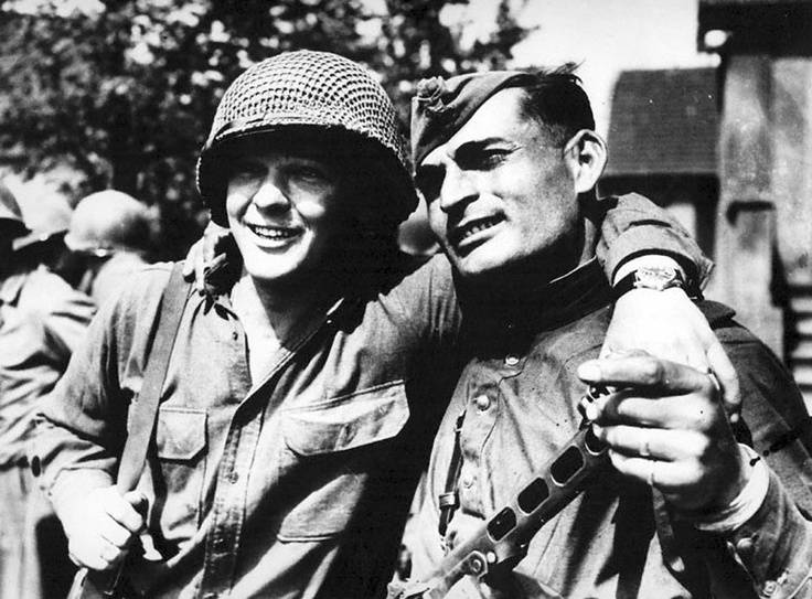 16. Un soldat Soviétique et un Marine Américain posent ensemble, à la libération