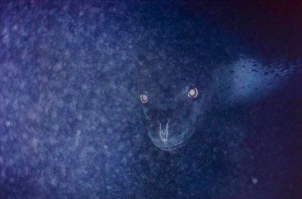 Force est de constater que plonger peut parfois réserver de sacrées surprises car il suffit que l'eau, déjà obscure, soit trouble pour que certains objets ou êtres vivants soient invisibles. Exemple avec cette étrange silhouette ci-dessous en forme d'œil qui a bien dû surprendre le photographe au premier abord.