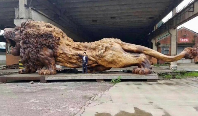Il a fallu plus de trois ans à 20 personnes pour transformer un seul tronc d'arbre en un lion géant baptisé « Oriental Lion ». Le sculpteur Dengding Rui Yao a dirigé l'équipe chargée de transformer l'énorme tronc de séquoia, qui se trouve désormais au Fortune Plaza Times Square de Wuhan, capitale de la province chinoise du Hubei.