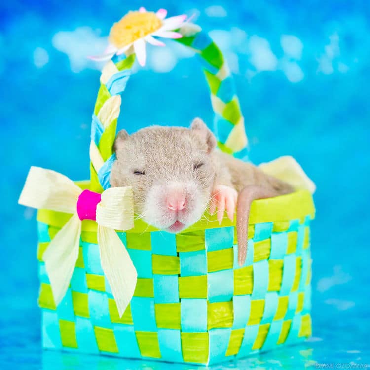 Armée de son appareil photo, Diane Özdamar photographie ses propres rats, ainsi que ceux de ses amis. Elle confectionne également des accessoires pour sublimer ses clichés. Cette dernière s’est lancée dans ce projet lorsqu’elle a découvert que certains rats domestiques étaient maltraités et abandonnés.