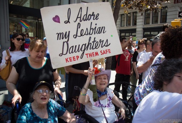 On découvre ainsi que cette femme, Frances Goldin, participe à la Gay Pride de New York depuis plus de 30 ans, et cela avec la même pancarte. Ses filles, Reeni et Sally Goldin (photographiées ci-dessous), résident actuellement à New York et San Francisco.