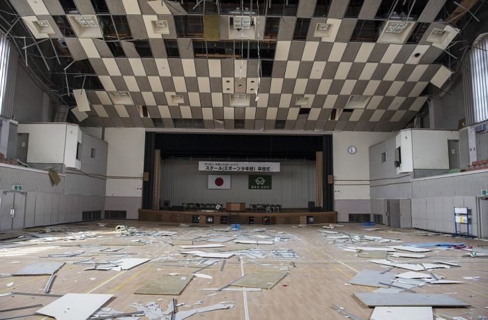 10. Le hall d'une école abandonnée. On voit bien ici les dommages causés par le tremblement de terre