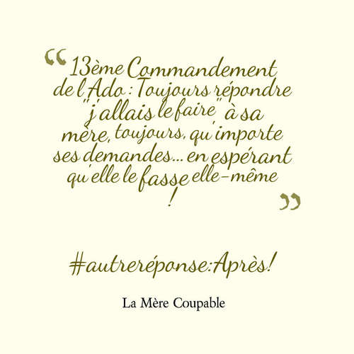 La Mère Coupable, nous l’adorons, et vous le savez. Comment ne pas apprécier une mère racontant avec humour son quotidien, qui est partagé par tant et tant de femmes ? En s’appuyant sur son expérience et ses observations, découlant de ses trois enfants, et notamment de son aînée de quatorze ans, elle partageait sur son blog il y a quelques semaines onze premiers commandements guidant la vie de la globalité des ados d’aujourd’hui. La suite vient de débarquer : voici les commandements 12 à 25, et toute identification serait purement fortuite !