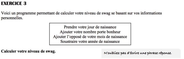 Dans le même contrôle, Claire a également demandé à ses élèves de calculer leur « niveau de swag ». Un problème sur les nombres relatifs qui répond à une partie « très classique du programme » selon elle. Enfin, dans un autre exercice, elle a nommé deux triangles « PNL » et « SCH » en référence au groupe de rap de l’Essonne et au rappeur marseillais, très populaires parmi les jeunes.