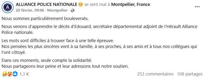 À Montpellier, un drame a eu lieu dans la nuit du jeudi 19 au vendredi 20 février. Edouard, un policier âgé de 40 ans et père de trois enfants en bas-âge, s’est suicidé avec son arme de service devant un commissariat de la ville. Il était brigadier-chef et secrétaire départemental adjoint du syndicat Alliance police nationale. Son décès survient quelques mois après celui de l'ambassadeur d'Afrique du Sud, qui a mis fin à ses jours en sautant d'un hôtel parisien.