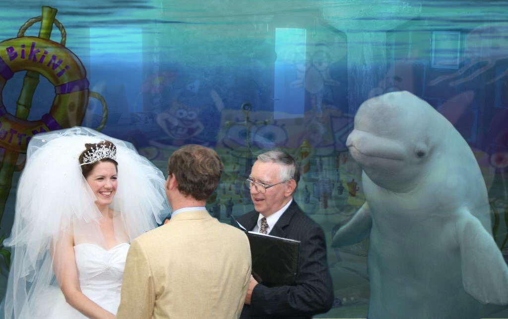 Mais ce n'est pas du tout de tout cela dont il est question ici. Car les couples ont pris l'habitude de venir faire leurs photos de mariage devant ces magnifiques animaux… Du coup, l'un de ces clichés où une baleine béluga fait un "photobomb" a fuité et il est devenu viral… au point de donner lieu à une véritable battle photoshop sur Reddit. Une image qui n'a pas manqué d'inspirer les internautes puisque l'animal prend une pose assez drôle, se tenant droit derrière le prêtre comme s'il participait à la cérémonie…