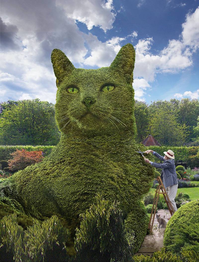 L’artiste et photographe britannique Richard Saunders a vécu 14 ans avec son chat gris « Tolly ». Il accompagnait l’artiste au quotidien même lorsqu’il travaillait dans son atelier. À sa mort, Richard Saunders a décidé de lui rendre hommage avec une série de clichés surréalistes baptisée The Topiary Cat.