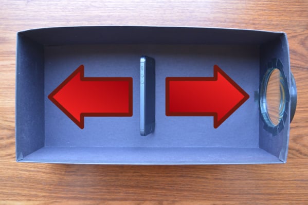 Une fois que vous avez réglé le téléphone, il ne vous reste plus qu’à trouver une surface blanche et à vous installer confortablement pour profiter du spectacle. Vous pouvez régler le focus et la netteté de l’image en faisant glisser le smartphone dans la boîte. Éteignez les lumières : « chut », la projection commence…
