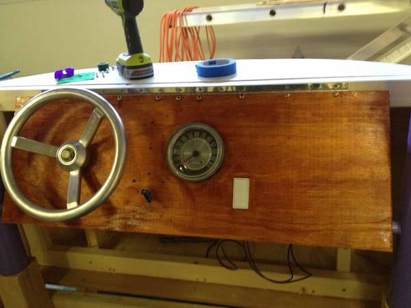 5- Le petit tableau de bord avec un volant récupéré d'une mini-voiture pour enfant et d'un compteur de vitesse