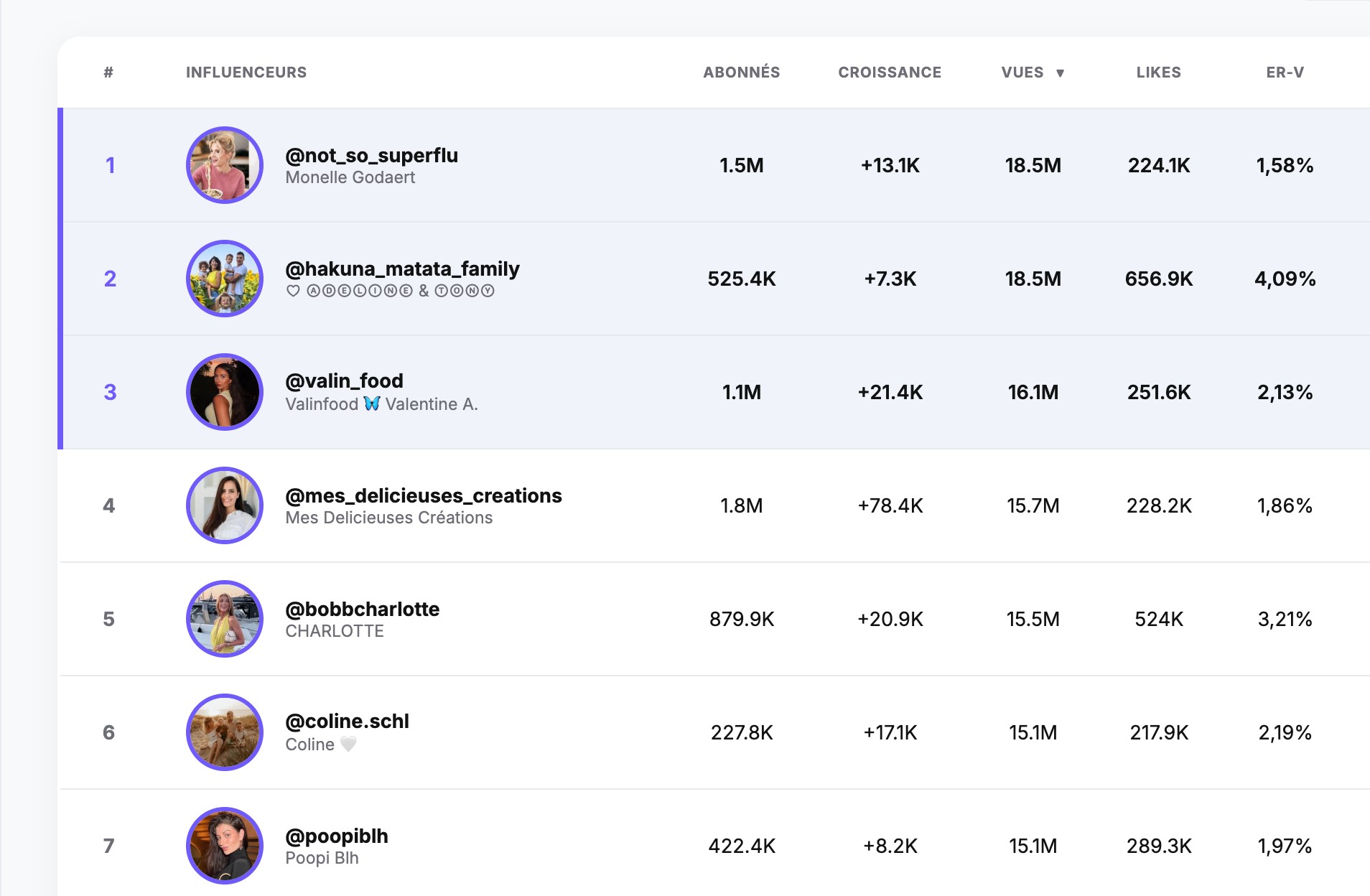 Chez Demotivateur, cette analyse repose sur l’utilisation d’outils propriétaires d’analyse de l’influence, conçus pour observer la performance réelle des créateurs et des contenus à grande échelle. À l’image des plateformes spécialisées du marché (Kolsquare / Hypeauditor...), ces outils permettent d’aller bien au-delà des indicateurs de notoriété classiques, en croisant des données de vues, d’engagement, de récurrence, de formats et de dynamiques de croissance.