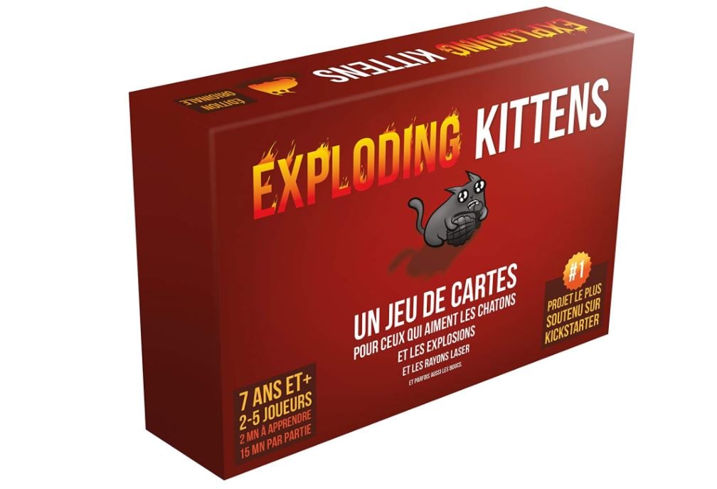 >> Le concept : Des chats kamikazes sont prêts à tout pour vous exploser à la figure ! Le but du jeu : Pour survivre, utilisez avec astuce vos cartes afin de faire piocher vos adversaires, passer votre tour ou échanger des cartes et repousser le moment fatidique. Les kits de désamorçage vous permettent de vivre un peu plus longtemps, à condition de les trouver ! Jeu de société le plus plébiscité sur la plateforme de financement participatif Kick starter, Exploding Kittens est un jeu simple à l’humour décalé.100 % fun, chaque partie est pleine de surprises et de coups tordus.