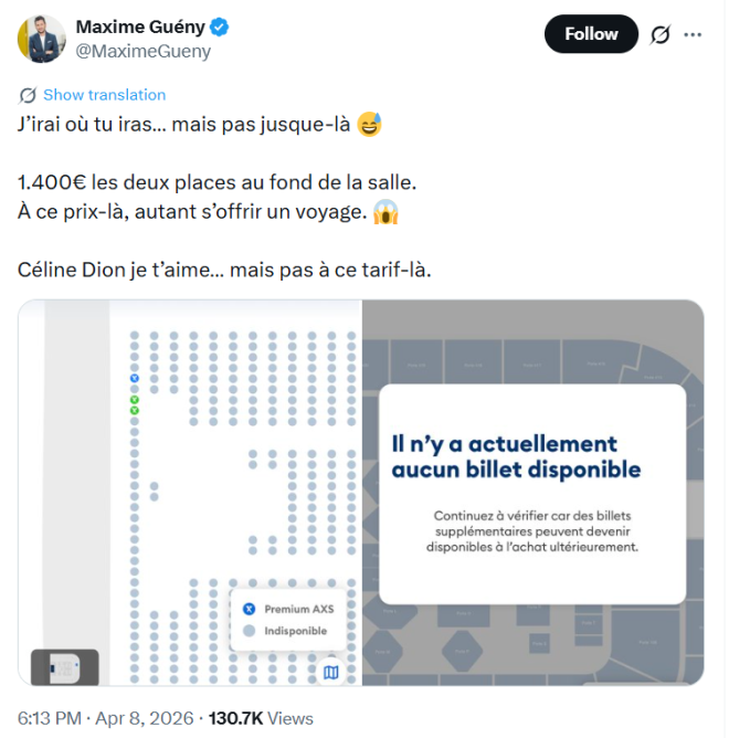 “J’irai où tu iras… mais pas jusque-là ! 1 400 euros les deux places au fond de la salle, à ce prix-là autant s’offrir un voyage. Céline Dion je t’aime… mais pas à ce tarif-là”, a indiqué le journaliste Maxime Guény sur son compte X.