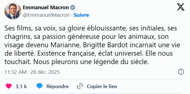 "La Fondation Brigitte Bardot annonce avec une immense tristesse, le décès de sa fondatrice et présidente, Madame Brigitte Bardot, actrice et chanteuse mondialement reconnue, qui a choisi d'abandonner sa carrière prestigieuse pour dédier sa vie et son énergie à la défense des animaux et à sa Fondation", a indiqué la Fondation dans un communiqué relayé par Corse Matin.