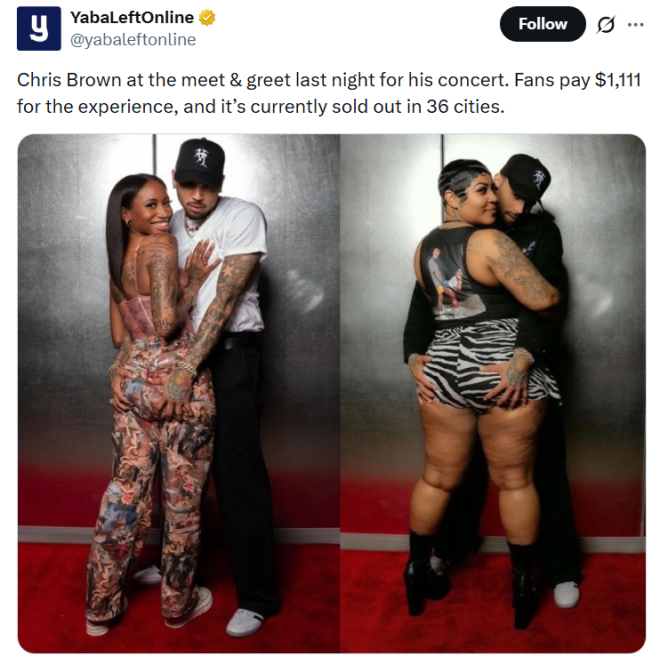 Si les fans de Chris Brown sont désormais habituées à ses lap dances et ses baisers langoureux en plein spectacle, certaines d’entre elles n’hésitent pas à se montrer proche de l’artiste une fois le spectacle fini. Lors de la séance photo avec les fans, certaines femmes demandent au chanteur de poser ses mains sur leurs fesses, ce qu’il accepte au prix de 1 000 dollars. Des particularités à savoir avant d’aller voir Chris Brown en concert !