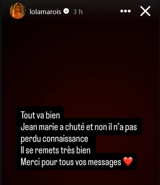 “Tout va bien. Jean-Marie a chuté et non, il n’a pas perdu connaissance. Il se remet très bien. Merci pour tous vos messages”, a-t-elle affirmé sur le réseau social.