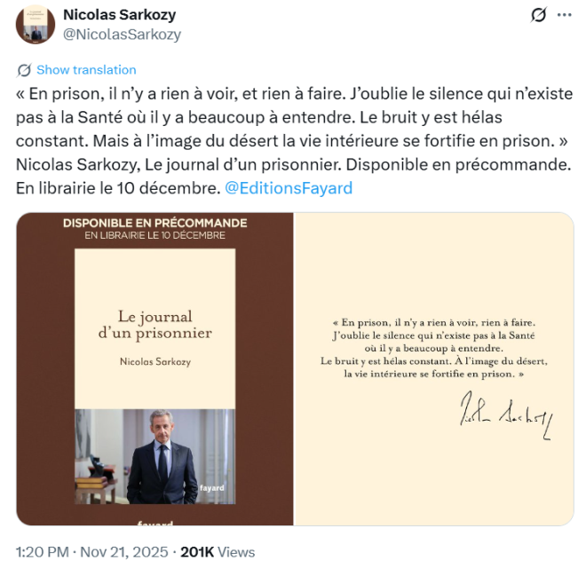 Nicolas Sarkozy a donc passé 20 jours incarcéré à la prison de La Santé. Un laps de temps pendant lequel il a écrit un livre sur son expérience, intitulé “Le journal d’un prisonnier”. Nicolas Sarkozy a lui-même annoncé la sortie de son livre ce vendredi 21 novembre en postant un message sur X.
