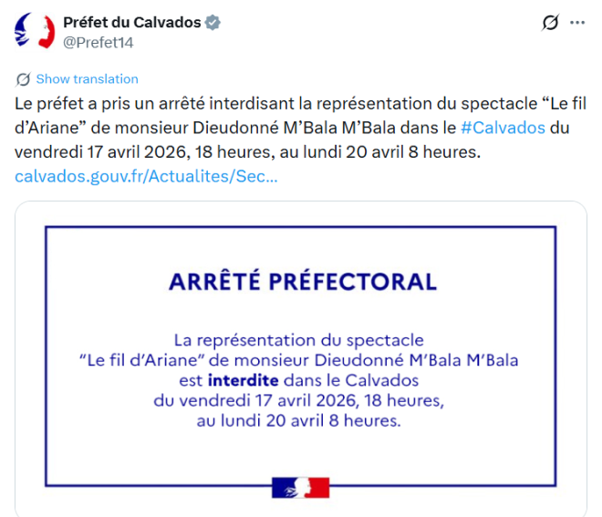 Alors que la préfecture du Calvados a publié un arrêté interdisant les spectacles de Dieudonné dans le département, celui-ci a affirmé qu’il souhaitait organiser un événement dans un rayon de 30 kilomètres autour de Caen.