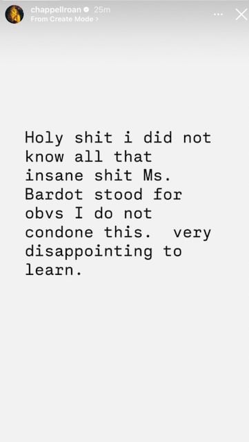 « Je n’avais pas conscience des positions de merde insensées de Mme Bardot. Bien sûr je ne cautionne pas. Très déçue d’apprendre ça », a-t-elle commenté.