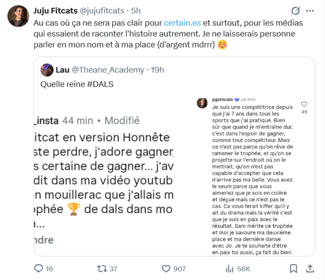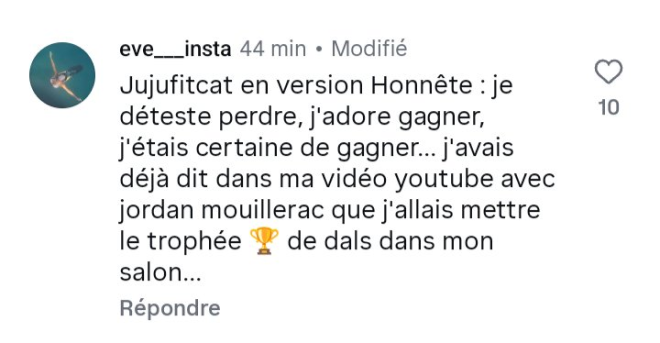 “JujuFitcats en version honnête : je déteste perdre, j’adore gagner, j’étais certaine de gagner. J’avais déjà dit dans ma vidéo youtube avec Jordan Mouillerac que j’allais mettre le trophée de DALS dans mon salon”, a commenté un internaute sur Instagram.