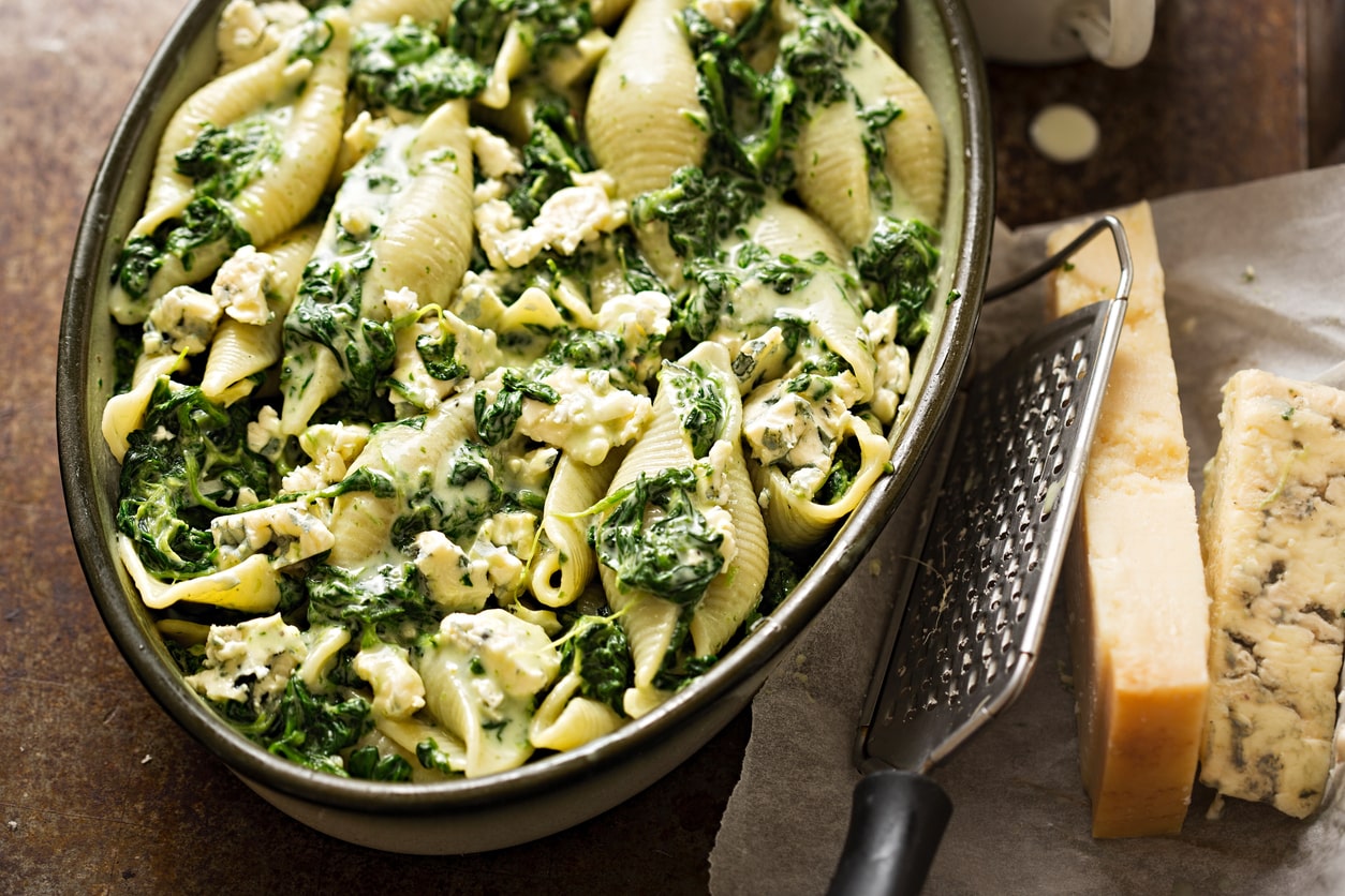 1. Cuisez les pâtes, réservez un peu d’eau de cuisson. Faites revenir l’ail et les épinards.