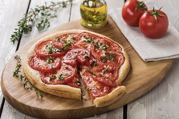 5. Saupoudrer la pâte feuilletée de mozzarella puis répartir les tranches de tomates en une couche uniforme. Assaisonner.
