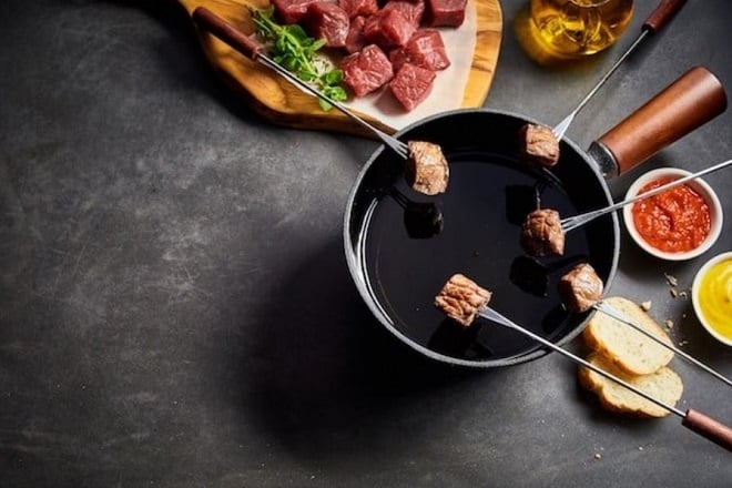 2.Piquez les cubes carnés et trempez dans la fondue. Savourez avec une assiette de frites !