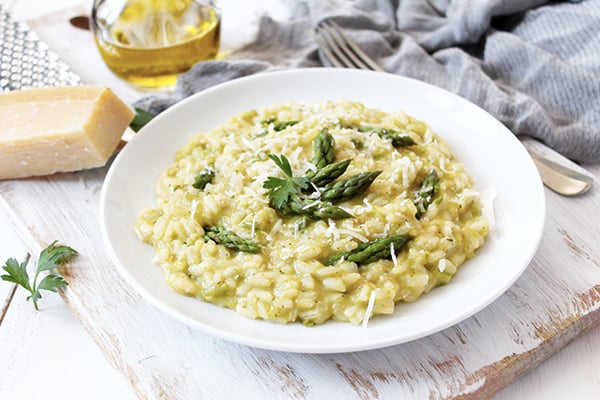 2. Dans une cocotte faire fondre le beurre. Ajouter deux échalotes ciselées. Saler. Faire revenir légèrement. Ajouter le riz et le faire revenir pour qu’il soit nacré. Déglacer avec le vin blanc. Ajouter un tiers du bouillon. Couvrir et laisser mijoter 5 minutes. Ajouter un autre tiers du bouillon, couvrir à nouveau et laisser mijoter 5 minutes. Verser ensuite le reste du bouillon et laisser à nouveau mijoter 5 minutes. Ajouter le parmesan et les asperges, bien mélanger et poursuivre la cuisson du risotto quelques minutes en le goûtant régulièrement pour qu’il ait la texture parfaite : fondant mais pas trop cuit.