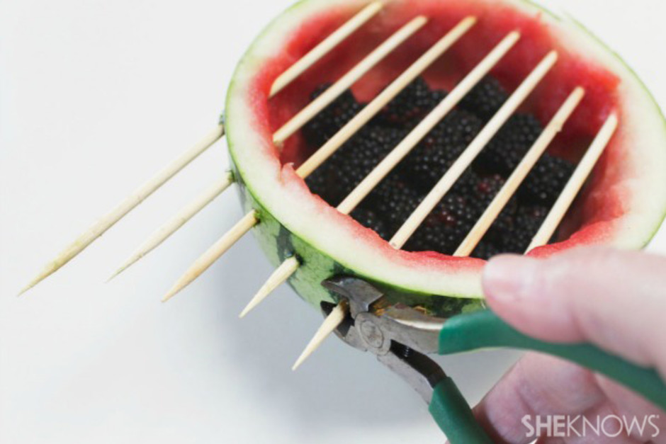 5. Prenez vos piques en bois et percez avec elles les rebords de la pastèque.