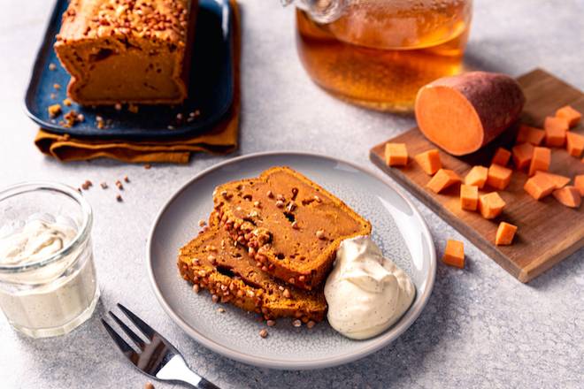 Au-delà de ses parfums gourmands, la Patate Douce de Caroline du Nord est un aliment très sain que l'on peut consommer sans modération. Riche en vitamines A et C, en calcium, en fibres et même en fer, elle est également très peu calorique (103 cal pour 114 g en moyenne). Alors on n'hésite plus et on se fait plaisir avec des recettes gourmandes à base de patate douce ! Découvrez ce délicieux gâteau, vous n'allez pas y résister…