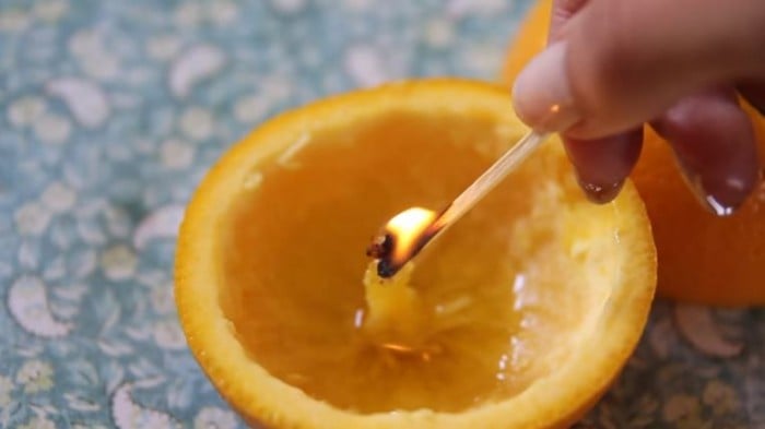 Cette dernière astuce est un peu délirante ! Coupez votre orange en deux sur la largeur, retirez délicatement la peau, ajoutez de la cire et une mèche. Allumez le feu et refermez votre orange avec la deuxième partie, découpée en son milieu. Vous obtenez ainsi une ravissante petite bougie maison.