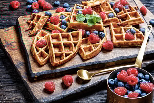 4. Faire préchauffer un gaufrier puis ajouter un peu de pâte dans chaque alvéole. Cuire environ 4 minutes. Servir avec vos fruits préférés, des noisettes ou des amandes concassées.