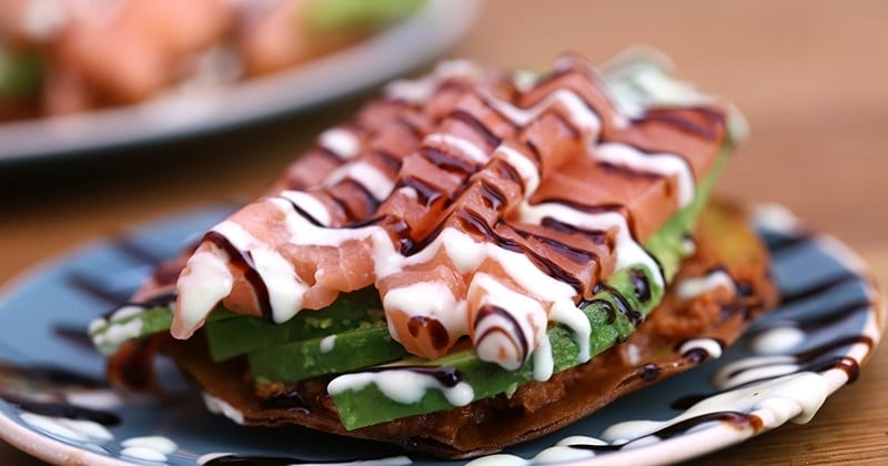 La recette se calque directement sur ce classique de la cuisine Mexicaine, à savoir une tortilla à la farine de blé garnie de légumes et de viandes. Cette drôle d’alliance entre le sushi et le burrito est particulièrement atypique, pour ne pas dire étrange, et pourtant, elle nous fait rêver.