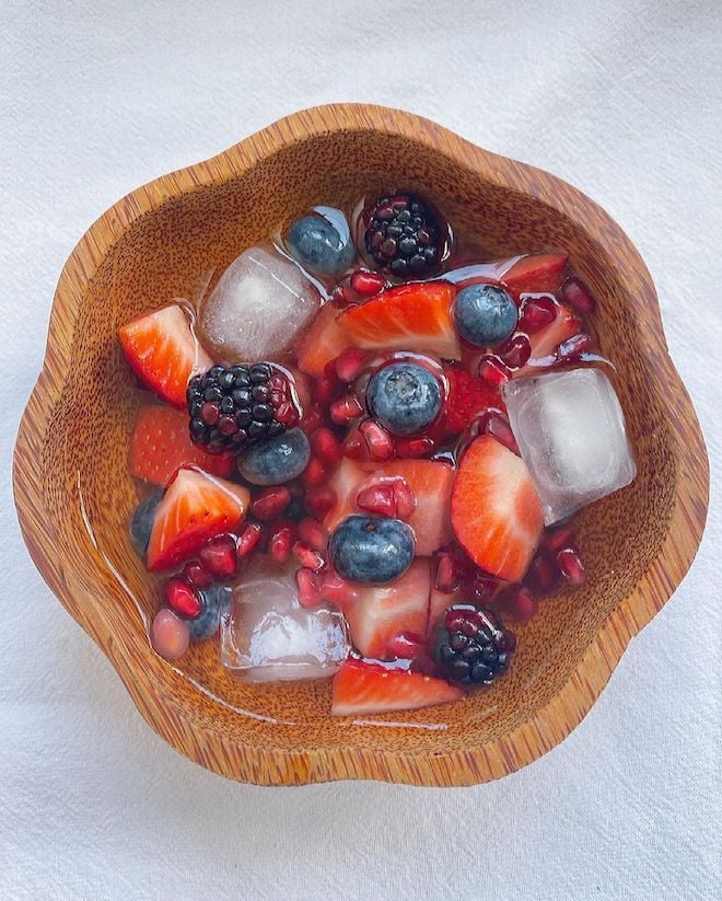 2. Recouvrir d'eau de coco et ajouter les glaçons. C'est prêt !