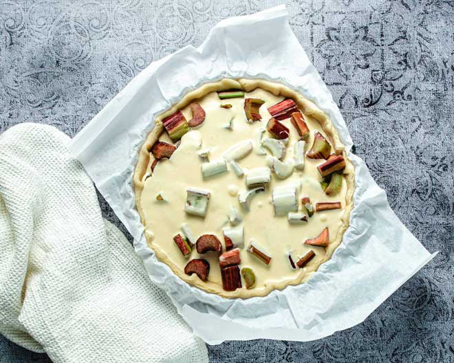3. Disposer de manière uniforme la rhubarbe et laisser reposer au frais pendant le reste de la préparation.