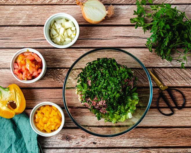 3. Découper l’oignon, les gousses d'ail, le poivron, le céleri en petits cubes et mélanger avec la chair à saucisses. Ajouter les cubes de tomates ainsi que le persil ciselé et bien mélanger. Assaisonner.