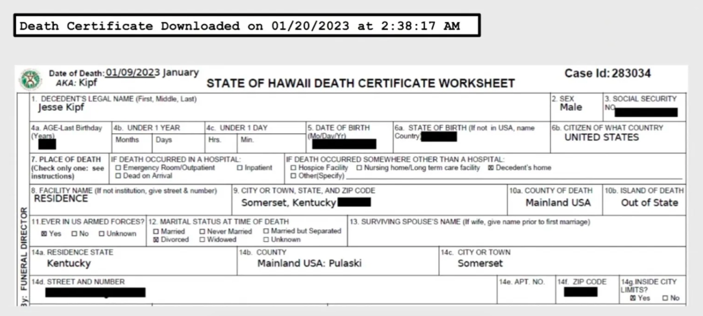 Tout commence le 20 janvier 2023 lorsque le compte utilisateur d'un médecin se connecte au service électronique d'enregistrements des décès de Hawaï. Cette connexion, qui se fait depuis un autre État américain, a pour but de certifier la mort d'un certain Jesse Kipf. Ce dernier aurait succombé à un « syndrome de détresse respiratoire aiguë » dû au Covid-19.