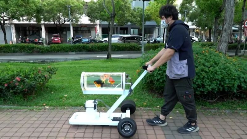 Jerry Huang est un Taïwanais qui vit à Taichung. Cet aquariophile est passionné de poissons, et pour passer un maximum de temps avec eux, il a décidé de créer un objet hors du commun. Jerry Huang a fabriqué une poussette qui lui permet de promener ses poissons à l’extérieur, dans les rues de sa ville.