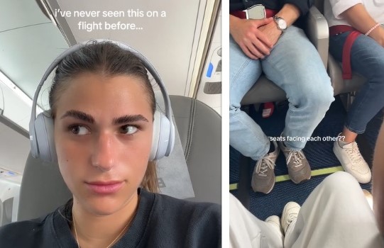 Quand elle s’est assise à sa place dans l’avion, Megan Homme a remarqué qu’elle se trouvait face à face avec d’autres passagers, comme on peut l’être dans un train. Sur sa vidéo, qui dure à peine cinq secondes, on peut voir Megan jeter des coups d’œil interloqués autour d’elle, avant de retourner sa caméra pour montrer aux internautes les passagers face à elle. Ce placement, qui est généralement courant dans les jets privés, ne l’est pas dans les vols commerciaux et encore moins en classe économique.