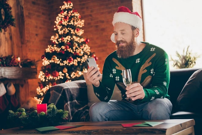 Un homme envoyant un message drôle pour souhaiter une bonne année par téléphone et non par carte Crédit photo : ViDi Studio