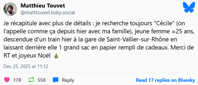 Pour tenter de retrouver la jeune femme, Matthieu a lancé un appel sur les réseaux sociaux. Il n’avait aucune indication pour la retrouver puisque le sac contenait de simples paquets avec des indications comme “pour belle-maman” ou “pour beau-papa”.